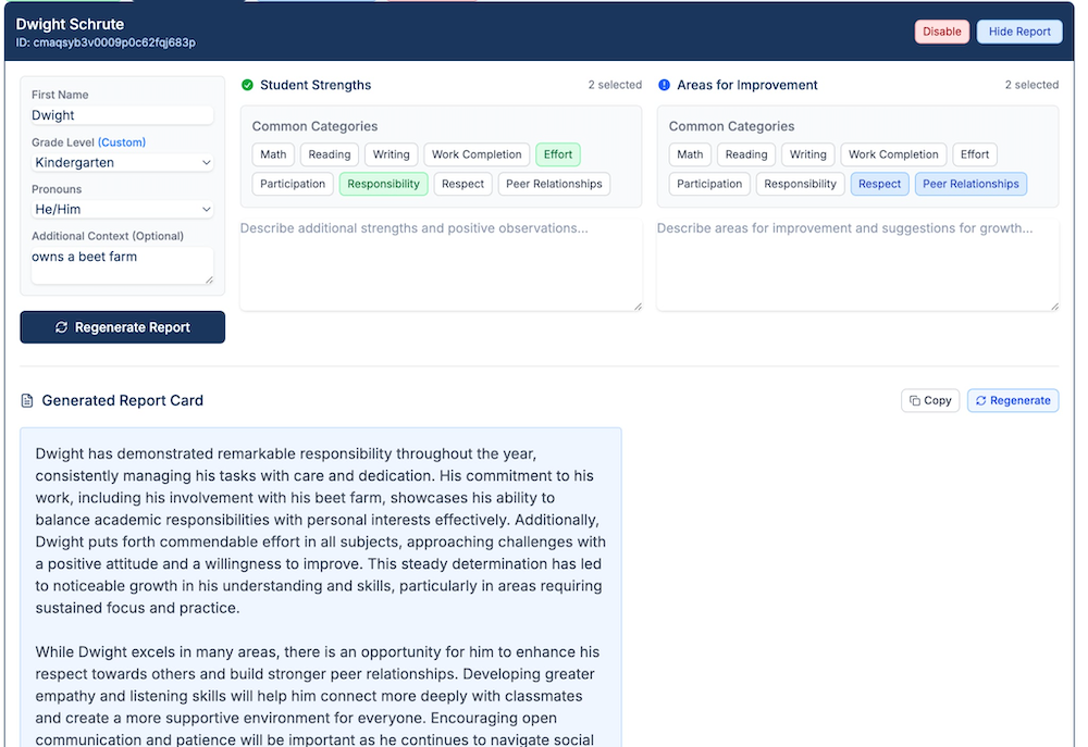 Pick your tone, choose focus areas, and generate a first draft you can quickly personalize. Built for teacher control and student privacy.