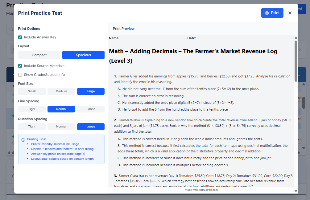 You can now print any practice test with one click. Clean layouts, proper page breaks, and student-friendly formatting.