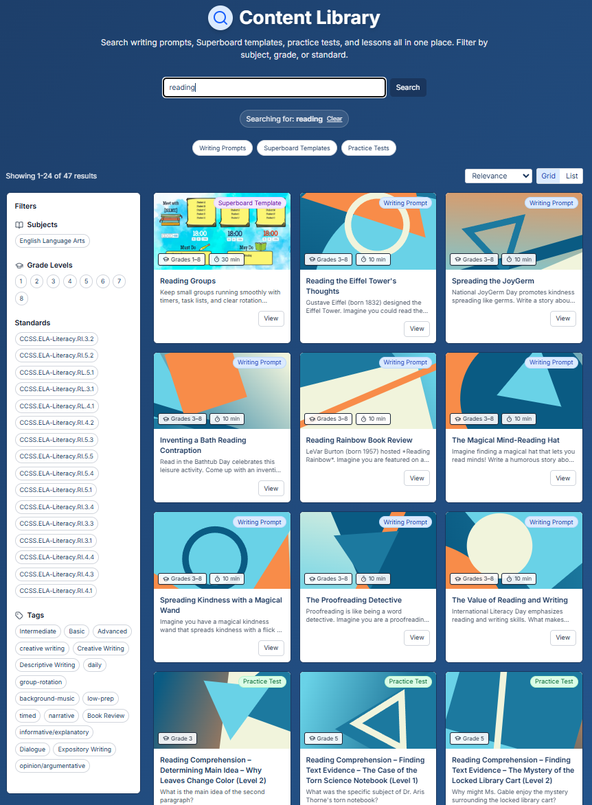 Writing prompts, practice content, and Superboard templates now live in one browsable library with visual cards. Filter by subject, grade level, or activity type.