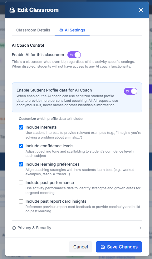 Teachers have granular control over how student profile data shapes AI Coach interactions. In classroom AI settings, teachers can enable or disable specific data types: