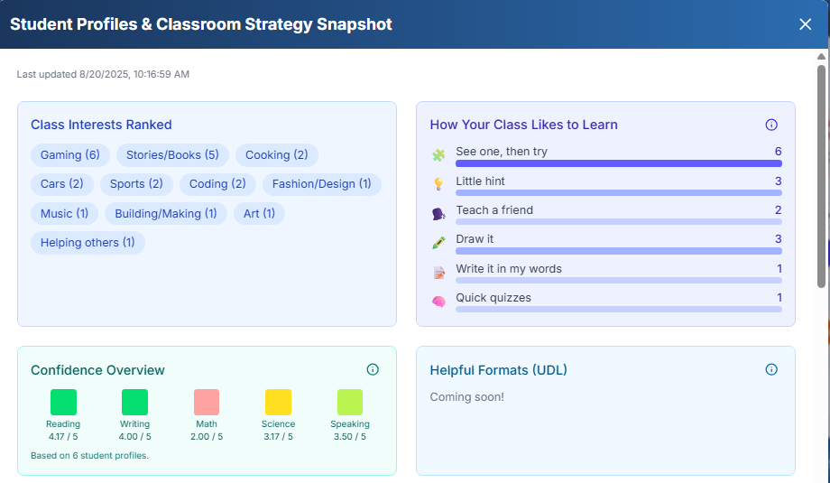 - Enhanced visual dashboards: Help teachers see identity clusters and expertise areas at a glance (so teachers can quickly identify which students share identity markers and leverage that for grouping and instruction)