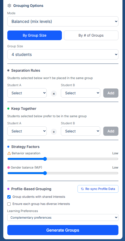 This isn't just convenience—it's intentional design that helps teachers honor student identity in grouping decisions without manual work. When students see their interests and preferences shape how they're grouped, they're seeing their identity valued in academic spaces.