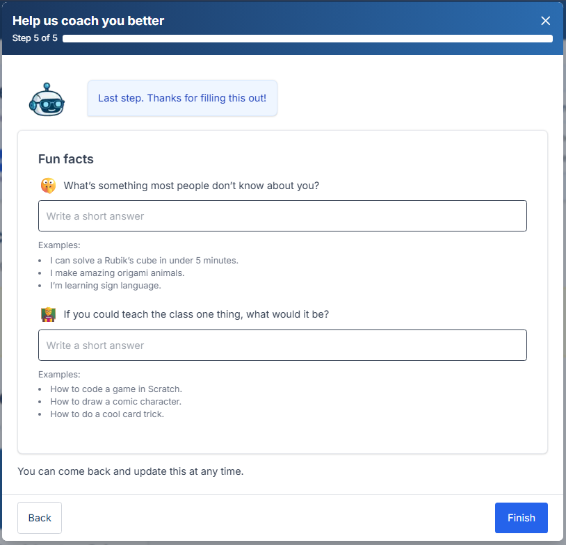 Example: If a student selected "animals" as an interest, when Coach needs an example for a math concept, it might use "calculating how fast a cheetah runs" instead of generic examples. If they selected "gaming," examples might reference game scores, win rates, or level progression.