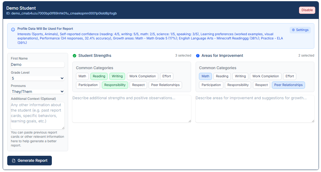 Teachers see a preview of what profile data will be included for each student before generating reports. Profile data is always optional and teacher-controlled—teachers can toggle it on or off universally, ensuring privacy and flexibility.