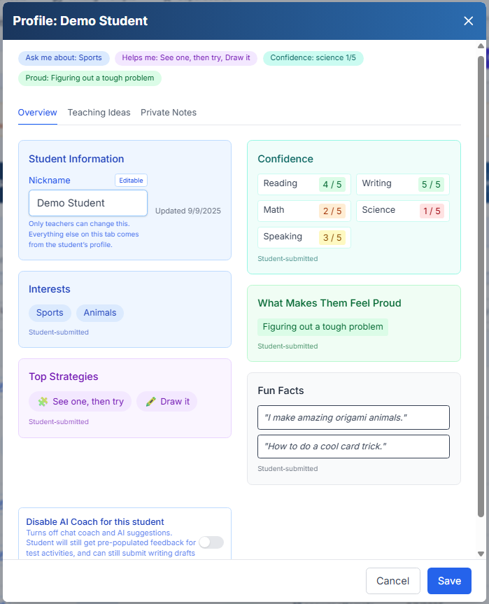 Students write freely about what they're good at, what they're working on, what they want teachers to know. These responses are teacher-only by default—never surfaced to peers or AI without explicit teacher choice. Teachers can optionally include these insights in report cards, but they're never automatically shared with AI coaching systems.