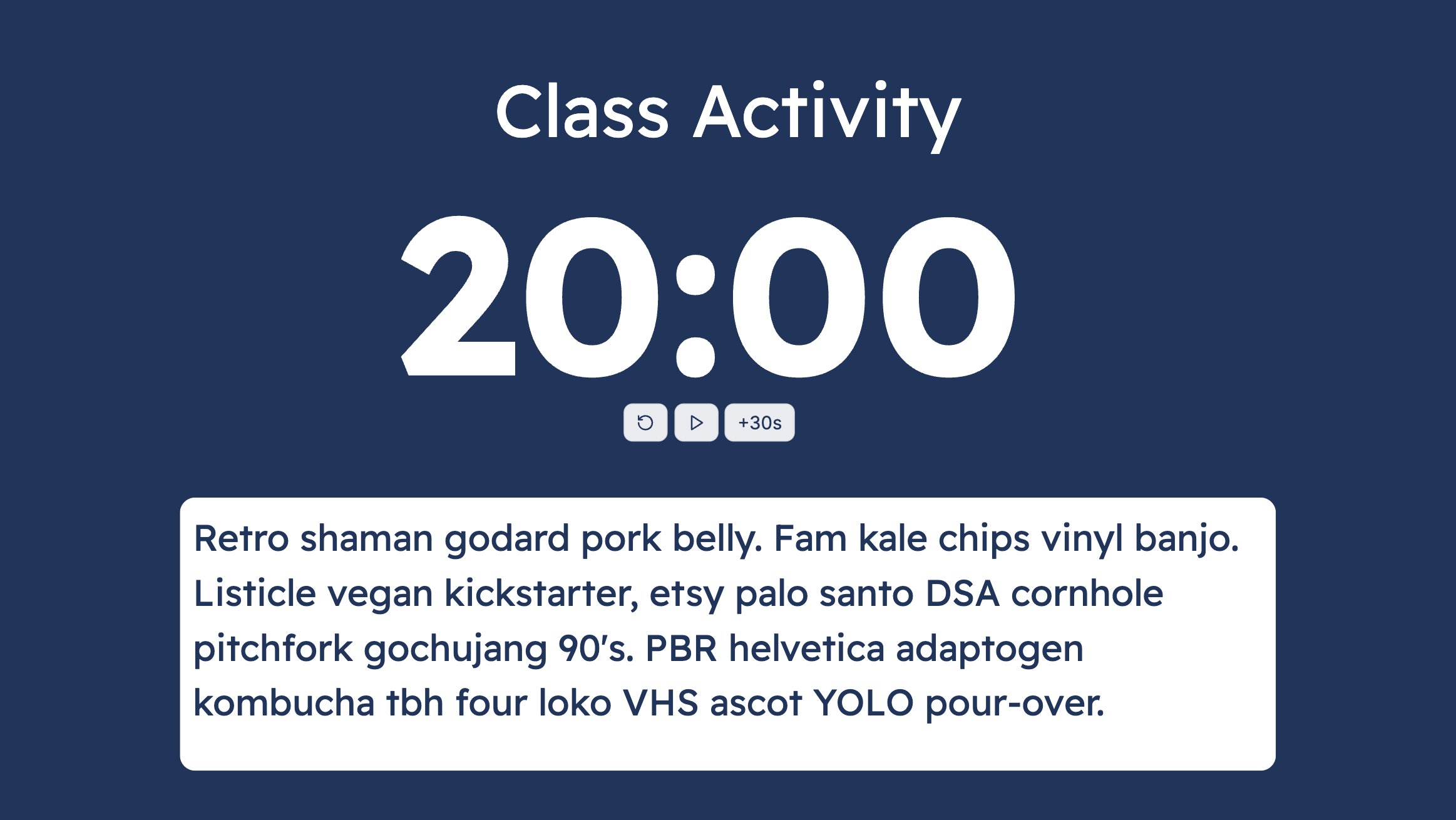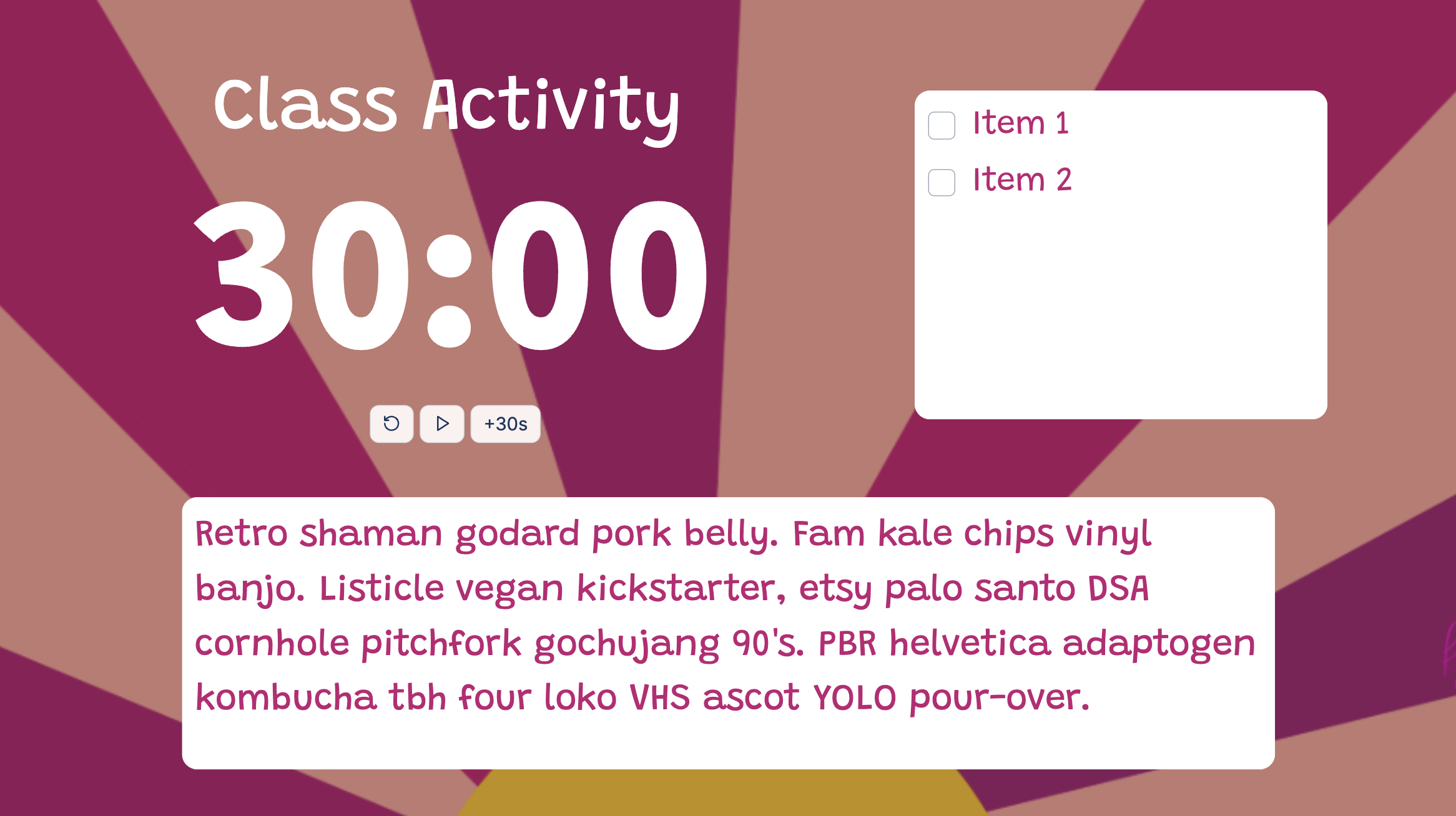 This is the timer that started it all - now as a simple template in Superboard. Drop in a customizable countdown, add instructions, and guide any block of time from start to finish. The second slide includes a variation that shows off customizable backgrounds, fonts, and checklist options, so you can make it match your day, your mood, or your class energy. Whether you're running a focused work block, a quick group sprint, or a quiet reading window, this slide gives you structure, pace, and flexibility.