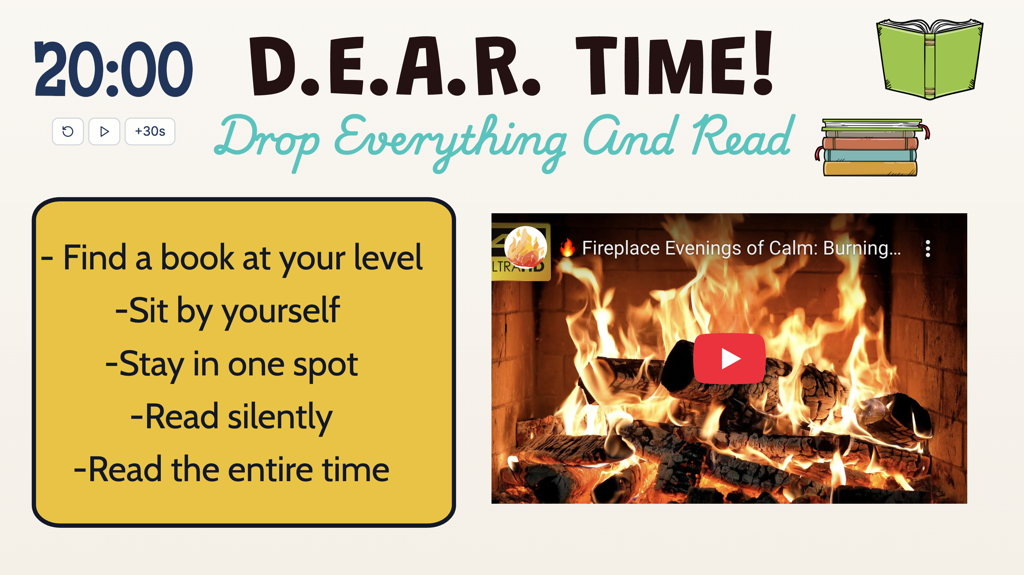 1. Show the board on your screen or projector. 2. Remind students to grab a book at their level. 3. Start the timer and play the fireplace video. 4. Encourage everyone to read quietly until time is up. 5. End with a short share or reflection about what they read.